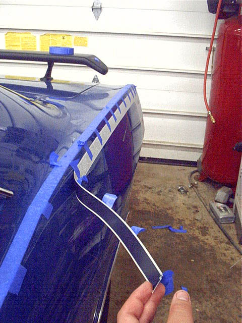 The front section of stripe is a separate section. Personally, I think it would be much easier if it were made as one long stripe which could be cut with a razor blade at the door when done, but its not. I used a couple pieces of tape to try to get it positioned in about the right location. There are no measurements given here, you just reference it from the rear section of the stripe.